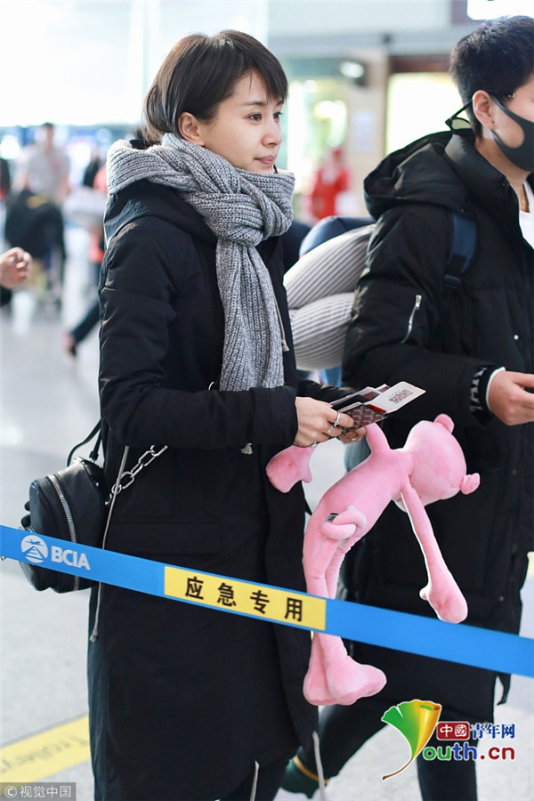 2017年12月10日,北京,王子文現(xiàn)身機(jī)場(chǎng),裹圍巾羞澀撓頭,少女感十足,提溜粉絲所贈(zèng)“粉紅豹”童心未泯。
