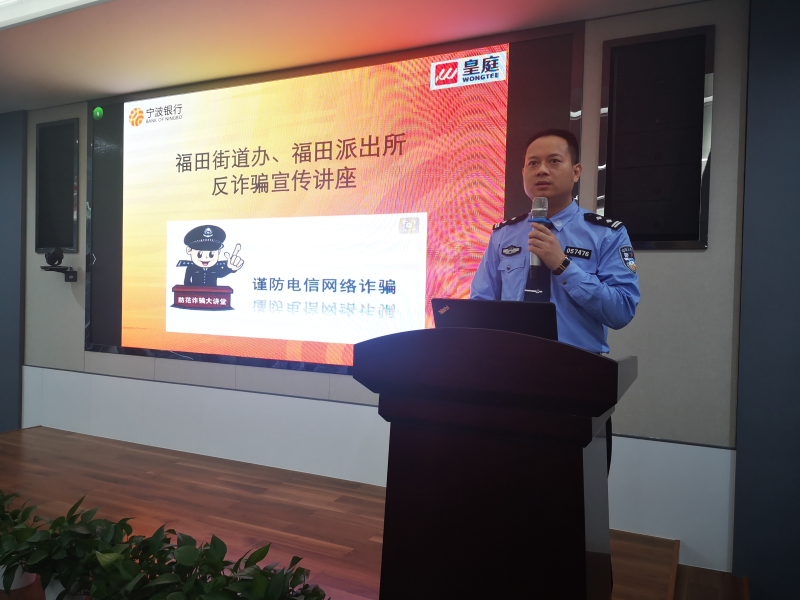 深圳新聞網(wǎng)訊 近年來,信息詐騙案件多發(fā),詐騙分子手段層出不窮,不僅給廣大市民造成了財產(chǎn)損失,更加將社會的反詐騙宣傳教育工作推向重要位置。為了普及廣大金融消費者的反詐騙知識,同時讓知識宣傳更接地氣,近日,寧波銀行深圳分行攜手深圳福田街道辦、福田派出所對皇庭中心大廈100多位商戶代表,開展了一場教育意義深刻的反詐騙知識講座。福田區(qū)副所長羅躍、福田派出所社區(qū)隊隊長莫予寶、福田街道辦政法辦主任馬建忠、皇庭物業(yè)總經(jīng)理吳海兵、寧波銀行深圳分行監(jiān)察保衛(wèi)部副總經(jīng)理陳久桐等9位警銀領(lǐng)導(dǎo)代表出席了本次活動。
