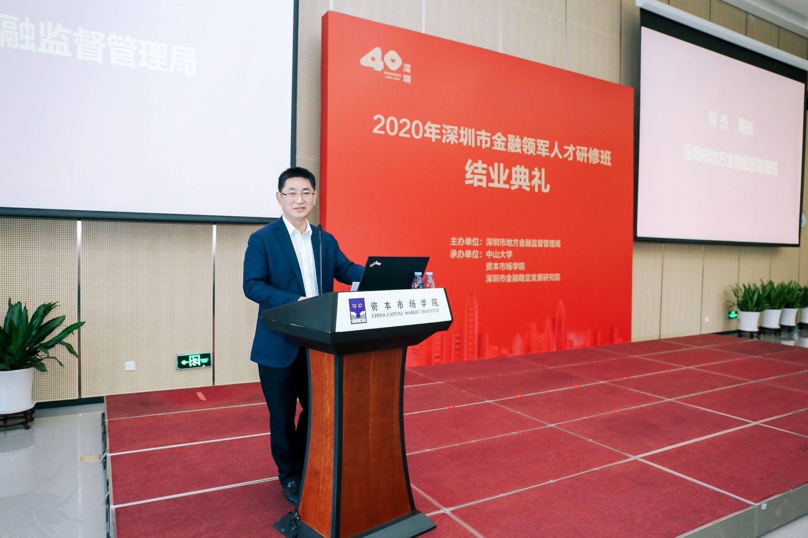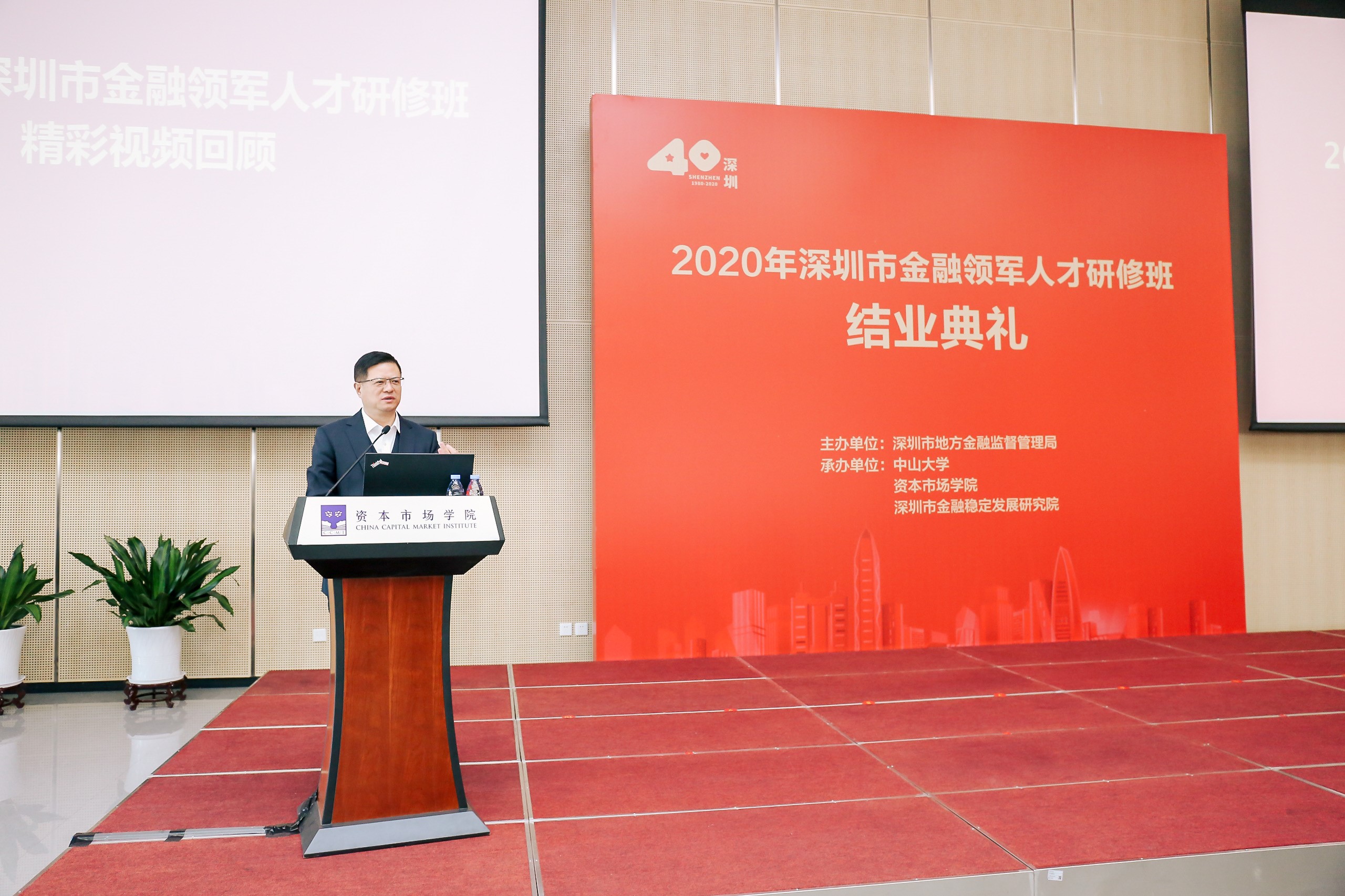 1月30日上午,2020年深圳金融領(lǐng)軍人才研修班結(jié)業(yè)典禮在資本市場學(xué)院隆重舉辦。本期研修班由深圳市地方金融監(jiān)督管理局主辦,中山大學(xué)、資本市場學(xué)院、深圳市金融穩(wěn)定發(fā)展研究院共同承辦。市地方金融監(jiān)管局黨組書記劉平生主持結(jié)業(yè)典禮并致辭,局長何杰作總結(jié)講話。資本市場學(xué)院副理事長、深圳市原副市長唐杰教授,資本市場學(xué)院黨委書記陳自強、院長金立揚、副院長張韶輝,深圳銀保監(jiān)局副局長陳飛鴻、深圳證券交易所紀(jì)委書記邢力紅,市地方金融監(jiān)督管理局副巡視員林居正,中山大學(xué)嶺南學(xué)院院長陸軍教授,以及市委組織部、人民銀行深圳市中心支行、深圳證監(jiān)局有關(guān)領(lǐng)導(dǎo)應(yīng)邀出席,本期研修班近110名學(xué)員參加活動。