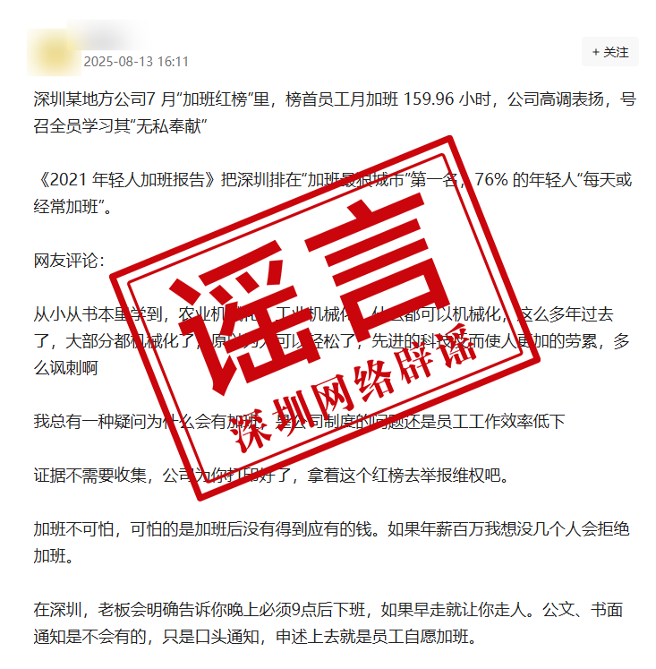 近日,一則《關(guān)于加班的通報(bào)表揚(yáng)》在社交平臺引發(fā)熱議。部分網(wǎng)帖將涉事企業(yè)與深圳強(qiáng)行關(guān)聯(lián),冠以“深圳某公司”名義進(jìn)行傳播,并稱深圳存在普遍的加班現(xiàn)象。經(jīng)核實(shí),涉事企業(yè)非深圳企業(yè)。