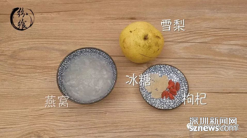泡發(fā)好的燕窩一份、雪梨一個(gè)、冰糖和枸杞若干。