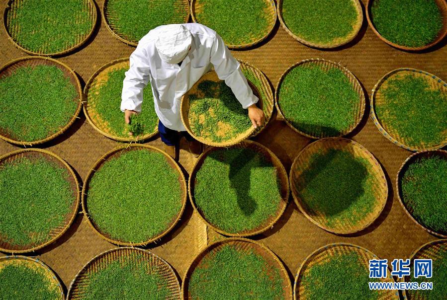 產(chǎn)于湖北省恩施土家族苗族自治州利川市毛壩鎮(zhèn)楠木村的“冷后渾”鮮葉,是制作利川紅茶最為優(yōu)質(zhì)的原料。工人先采下“冷后渾”茶樹鮮葉,后經(jīng)萎凋、揉捻、發(fā)酵、烘烤、篩選、整形、品級等工藝,歷時十多個小時,最終制成的紅茶沖泡后湯色紅艷明亮、滋味醇厚甘爽。在茶湯冷卻后,湯色逐漸變渾,加熱后又恢復(fù)紅艷明亮,這也是“冷后渾”得名的由來。新華社發(fā)楊順丕攝
