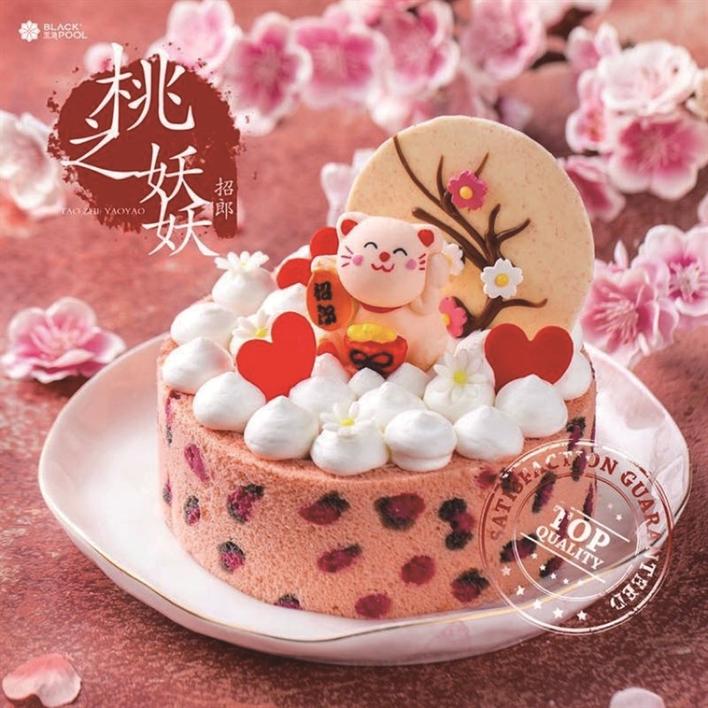 據(jù)黑池產(chǎn)品經(jīng)理介紹,“招郎蛋糕”是黑池最近重磅推出的新產(chǎn)品。蛋糕周圍覆盆子果干點(diǎn)綴而成的粉色豹紋,讓整個蛋糕充滿了野性魅惑又不失少女甜美。最為吸引眼球的,則是蛋糕表面,被桃花簇?fù)碇囊恢弧罢欣蛇鳌?。這只軟萌可愛的“招郎喵”,象征著,對得到這款蛋糕的人,最美好的祝愿,希望他們能夠遇到最好的愛情,找到心目中的那個他。