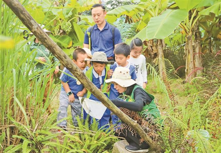學生在志愿老師的帶領下探秘濕地,親近自然。