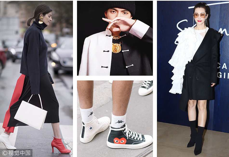 ????從Nike AJ1鴛鴦鞋的穿搭,到吳亦凡在某節(jié)目里一身黑白太極西裝炸翻全場,似乎混潮圈的人沒有不穿鴛鴦色的。不對稱拼色設(shè)計怕是會逼“死”強迫癥,但你不得不承認鴛鴦色的拉轟吸睛功力,想要在街頭上獨樹一幟鴛鴦色不會讓你失望。(圖片來源:視覺中國)