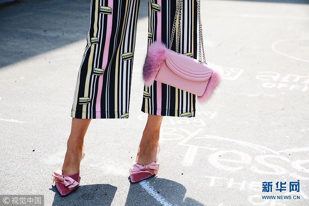 ??? 2016秋冬巴黎高定時裝周:街頭潮人(7月5日)。 粉色,流蘇,蝴蝶結,魚嘴,一字帶,綁帶,高跟鞋,涼鞋。(圖片來源:視覺中國)