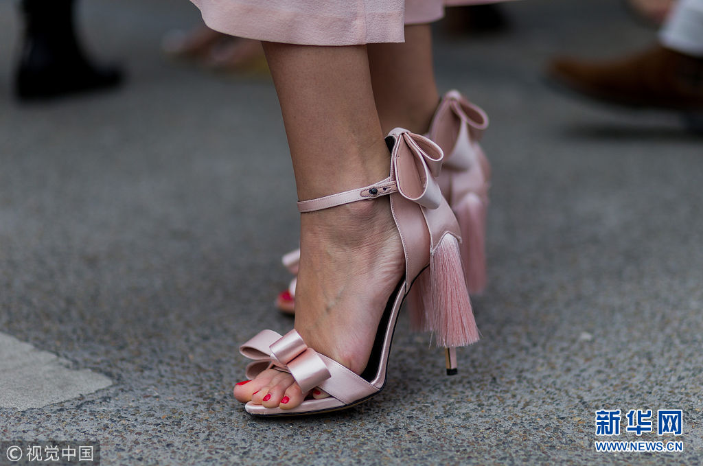 ??? 2016秋冬巴黎高定時(shí)裝周:街頭潮人(7月5日)。 粉色,流蘇,蝴蝶結(jié),魚(yú)嘴,一字帶,綁帶,高跟鞋,涼鞋。(圖片來(lái)源:視覺(jué)中國(guó))