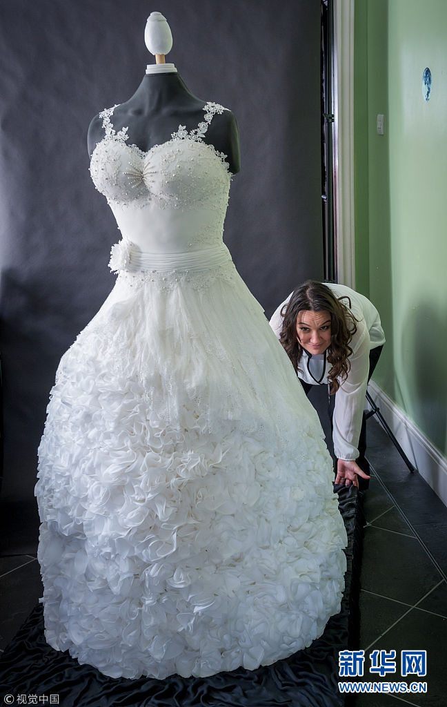 ????2016年4月11日訊(具體拍攝時(shí)間不詳),真實(shí)尺寸大小的婚紗蛋糕。蛋糕重140斤,高1.7米。它由著名的蛋糕師Sylvia Elba設(shè)計(jì),并由Elba、Yvette Marner、Ilinka Rnic三人整整用了300多個(gè)小時(shí)方才完成。 (圖片來源:視覺中國)