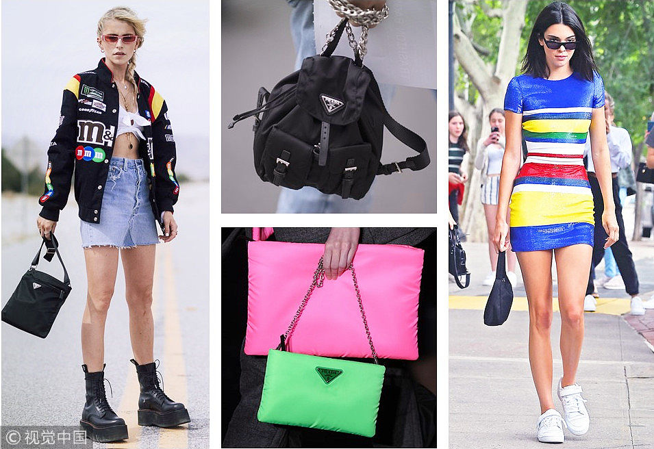 ????小編發(fā)現(xiàn)自打今年年初開始,歐美潮流圈的各路時髦精們一時間都開始團寵Prada的尼龍包,土酷古板的外形和中性的面料,怎么看都跟時髦不沾邊,但是就是這么莫名其妙的迎來了自己的“第二春”!經(jīng)典的Prada尼龍包的設計,其實非常簡單實用,明顯的Prada三角Logo,搭配看起來超級商務的全黑和正經(jīng)的拉鏈設計,可以說是非常的中規(guī)中矩了,但是就是這樣規(guī)規(guī)矩矩的設計,卻意外和現(xiàn)在正火的街頭風和復古風特別搭調(diào),火遍大街小巷~ (圖片來源:視覺中國)