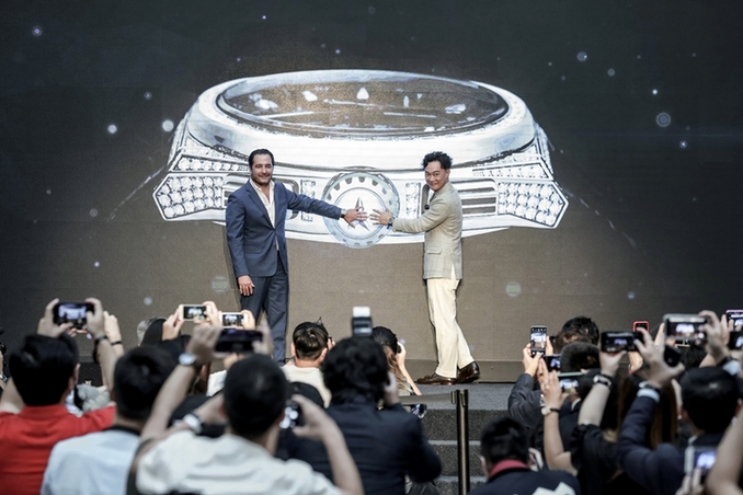 ????真力時(shí)全球首席執(zhí)行官朱利安?托內(nèi)爾先生與陳奕迅共同按動(dòng)了大屏幕上的虛擬時(shí)計(jì)表冠