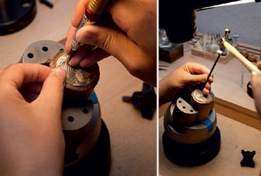 ????17世紀(jì)由法國(guó)Huguenot教的手工藝人傳入瑞士的金雕工藝,是構(gòu)筑整個(gè)鐘表體系的重要特征。時(shí)至今日,寶珀仍堅(jiān)持將之引為不可或缺的制表傳統(tǒng)。最傳統(tǒng)與純正的金雕工藝需完全依靠手工完成。瑞士國(guó)寶級(jí)金雕大師在平面上畫出素描圖,然后以各類手工工具在表盤或夾板的方寸間直接用刀尖雕出紋飾與圖案,最后用鑿子將圖畫按照適當(dāng)?shù)窨田L(fēng)格進(jìn)行細(xì)加工,為鐘表作品賦予更具表現(xiàn)力與個(gè)性化的藝術(shù)風(fēng)情。不同的雕刻方法選用不同工具,金雕大師工作桌上擺放逾40支雕刻刀絕非奇事。