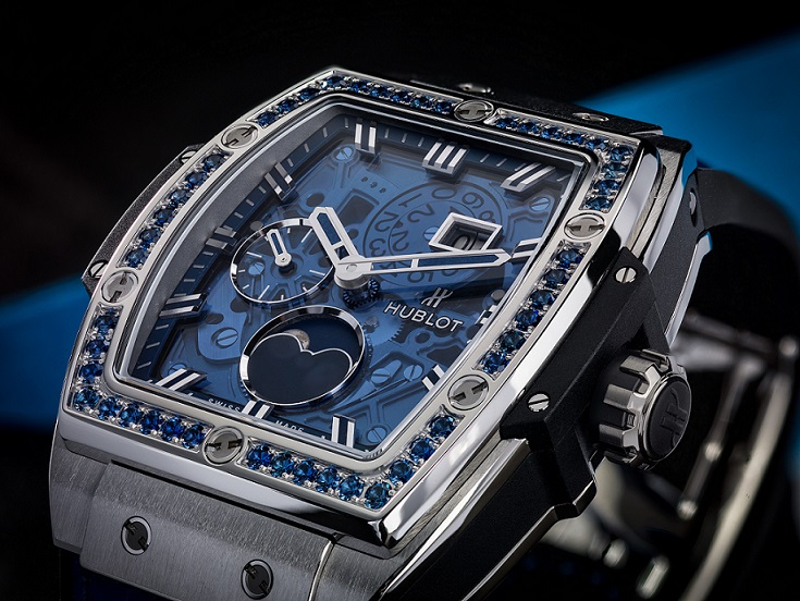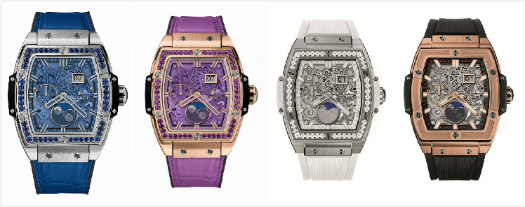 左起:宇舶表Big Bang靈魂系列月相鈦金藍(lán)色,宇舶表Big Bang靈魂系列月相王金紫色,