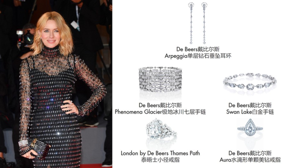 娜奧米?沃茨佩戴戴比爾斯珠寶出席威尼斯電影節(jié)