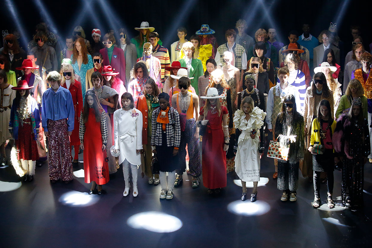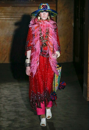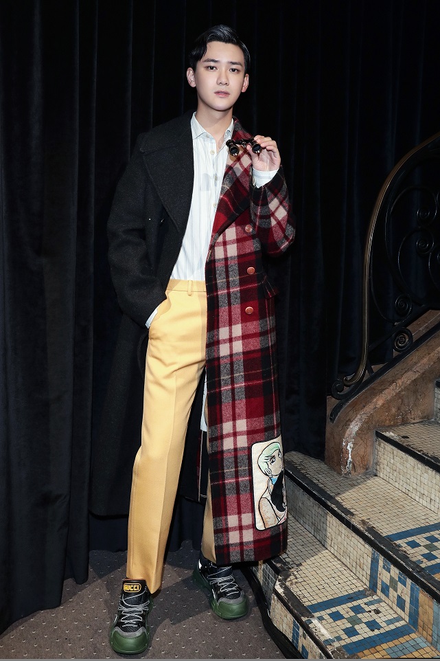 熊梓淇穿著Gucci2018秋冬系列Look49飾動漫圖案拼接大衣,條紋襯衣,搭配米色休閑長褲及Flashtrek系列運(yùn)動鞋。