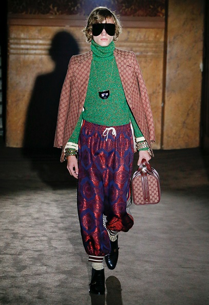 蔡依林穿著Gucci2019早春系列Look11金屬質(zhì)感印花上衣,雙G印花運(yùn)動長褲,搭配拼接撞色高跟鞋,水晶細(xì)節(jié)耳墜及金屬大框眼鏡,手拿虎頭裝飾皮革肩背包。
