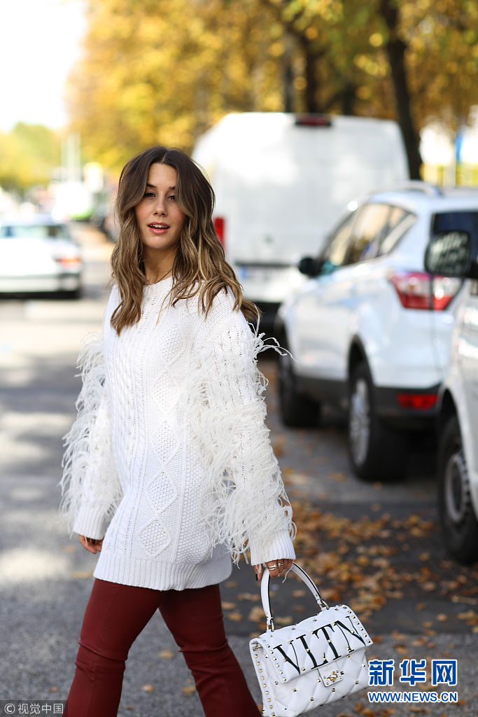 時(shí)尚博主Janina Pfau街拍。毛袖毛衣,手袋,發(fā)型:長(zhǎng)發(fā),卷發(fā),中分,棕發(fā),挑染,上衣:毛衣,白色,毛毛,鴕鳥(niǎo)毛,毛袖,長(zhǎng)袖,配飾:手袋,手拎包,白色,字母,logo,印花,鉚釘包,白色。(圖片來(lái)源:視覺(jué)中國(guó))
