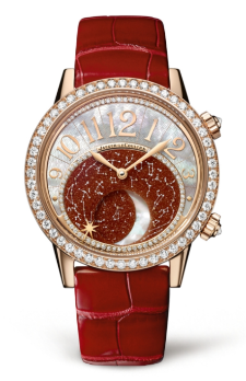 積家 Rendez-Vous Moon約會(huì)系列月相腕表玫瑰金款呈現(xiàn)奔放熱情的迷人魅力,精致閃耀的表殼宛如一曲獻(xiàn)給璀璨夜空的頌歌。腕表以無限詩意展現(xiàn)大工坊制表大師的精湛技藝,浩瀚縹緲的星空?qǐng)D案鐫刻于腕表之上,令人沉醉。熱情的火光色彩“鋪滿”玫瑰金表殼之上,紫紅色砂金石表盤呈現(xiàn)北半球的浩渺蒼穹。表盤和表殼均以鉆石鑲嵌,流光溢彩。珍珠母貝打造的一彎明月在浩瀚星空中緩緩移動(dòng),與顯示數(shù)字時(shí)標(biāo)的表盤采用相同工藝打造,散發(fā)皎潔光彩。一枚星形指針,以最富詩意的方式提示著佩戴者下一個(gè)約會(huì)的時(shí)間。