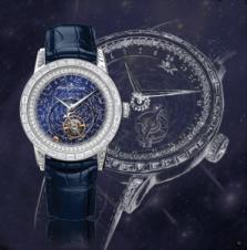 積家 Master Grande Tradition Tourbillon Céleste超卓傳統(tǒng)陀飛輪大師系列星空腕表以讓人目眩神迷的方式詮釋時(shí)間。為了充分展現(xiàn)腕表的天文特性,軌道式飛行陀飛輪顯示的為恒星時(shí)間而非太陽時(shí)間,比太陽時(shí)間縮短近四分鐘。在這款腕表的表盤外沿,附帶太陽標(biāo)志的指針以24小時(shí)為一周在表盤上轉(zhuǎn)動(dòng)。表圈顯示了24小時(shí)刻度、黃道十二宮星座與月份。軌道式飛行陀飛輪與星辰和星座同步運(yùn)轉(zhuǎn),和表盤共演一段恒星之舞。