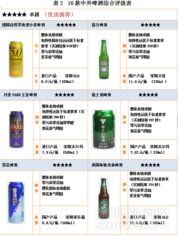 16款中外啤酒中,6款評(píng)級(jí)五星,國(guó)產(chǎn)與進(jìn)口各3款,分別為:德國(guó)自然渾濁型小麥啤酒 、喜力啤酒 、丹麥FAXE王室啤酒 、嘉士伯啤酒、 雪花啤酒、美國(guó)布魯克林啤酒。獲得四星評(píng)級(jí)的有6款,國(guó)產(chǎn)5款進(jìn)口1款,4款三星評(píng)級(jí)均為進(jìn)口啤酒。另外,16款中外啤酒均未出現(xiàn)違規(guī)使用添加劑和污染物超標(biāo)情況,均符合國(guó)家食品安全標(biāo)準(zhǔn),甲醛含量均優(yōu)于國(guó)標(biāo)要求。