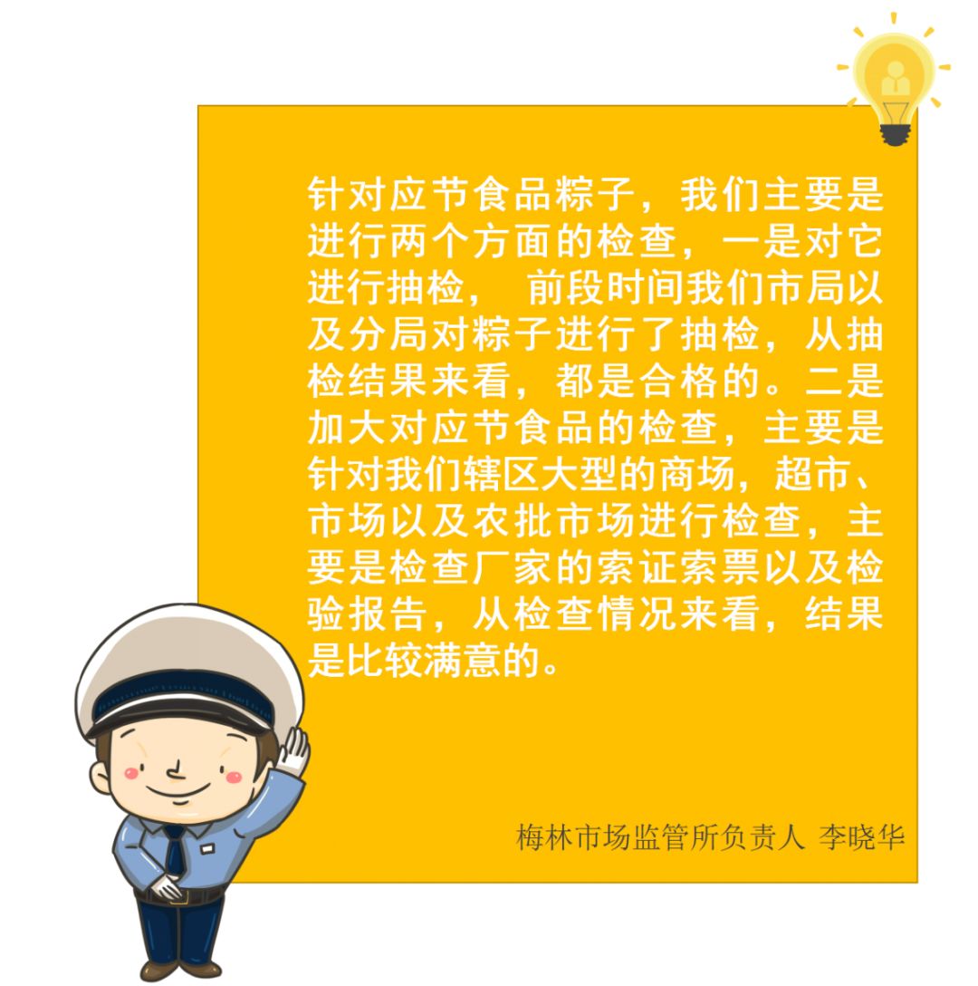 一年一度端午“粽”動員時刻到! 現(xiàn)在是不是想品嘗粽子的美味了? 肉粽肥瘦恰當?shù)娜澫?/p> 蛋黃粽蛋黃留油的鮮潤 白粽沾綿糖的甜醇...... 于是總會來一場 甜咸粽黨battle 而有職業(yè)病的食安君只想關注安不安全 先關注下本期的【食安周報】 2019年食品安全抽樣檢驗情況通報 (第二十一期) 本次共抽檢生產、流通、餐飲環(huán)節(jié)應節(jié)食品(粽子)200批次,涉及經營主體123家次,共檢測食品指標1738項次,全部檢測合格。 全部合格 深圳的小伙伴 看完這個抽檢 吃起粽子來,就更安心啦~ 抽檢現(xiàn)場 針對應節(jié)食品粽子 執(zhí)法人員進行兩個方面的檢查 戳視頻直擊檢查現(xiàn)場 現(xiàn)場還對制作粽子原料糯米 還有蔬菜進行快檢 糯米我們檢測了黃曲霉毒素B1 沒有發(fā)現(xiàn)問題 蔬菜樣品(農藥殘留)抑制率都低于50% 兩個都是合格的 可以放心吃 但是你懂得怎么吃嗎? 食安君這就告訴你 吃粽子的正確姿勢? 食用過量粽子而引發(fā)消化不良的情況時常發(fā)生老人、小孩和有胃腸道基礎疾病的人 要格外注意! 粽子好吃但要適可而止 粽子選購秘籍 說起買粽子,食安君又要老生常談了,一定要通過正規(guī)渠道購買哦,不要購買路邊的“三無”粽子。 同時注意查看外包裝的食品標簽,如生產日期、保質期、生產者名稱和地址、成分或配料表、食品添加劑、食品生產許可證編號等標識是否齊全;并仔細檢查粽子包裝是否完整,真空包裝是否漏氣漲袋,散裝粽子有無變質現(xiàn)象等。 健康吃粽小貼士 1.粽子大多屬于高糖、高鹽、高能量食物,不宜過量食用,尤其是糖尿病、三高、肝膽等疾病患者,一定要控制食用量。 2.吃粽子時,最好搭配一些蔬菜、湯羹等,既均衡營養(yǎng),又有助消化;同時,盡量少蘸醬油、砂糖等調味料,這樣會增加鈉和糖的攝入,不利于健康。 粽子好吃不貪吃 上周,我們向市民發(fā)出了 “你點名,我們來抽檢”的倡議, 我們的食品安全快檢車就來到福田梅林 食品安全快檢車 最后 食安君還是要提醒大家 外出就餐要到證照齊全 環(huán)境衛(wèi)生的餐館 學會看“笑臉”選餐廳 不選擇無證或衛(wèi)生環(huán)境差的路邊攤 歡迎大家積極參與食品安全監(jiān)督工作 關注每周食品抽檢信息公布 欄目:食安周報 民以食為先,食以安為天,食品安全是社會各界最為關注的重點。深圳市市場監(jiān)管局聯(lián)合《第一現(xiàn)場》欄目推出《食安周報》欄目,發(fā)布食品安全權威信息,為市民帶來第一手食安資訊。 播出時間:每周二晚上7:30 播出平臺:深圳廣電《第一現(xiàn)場》 每周抽檢信息通報 定期公布最新的食品及食用農產品抽檢信息。 案件現(xiàn)場 直擊市市場監(jiān)管局執(zhí)法人員現(xiàn)場執(zhí)法,以案件解讀食品安全知識,增強現(xiàn)場感。 食品安全科普 對食品安全相關知識進行科普,回應近期食品安全相關謠言,提示食品安全風險。 編輯整理:深圳食事藥聞 轉載請注明以上內容