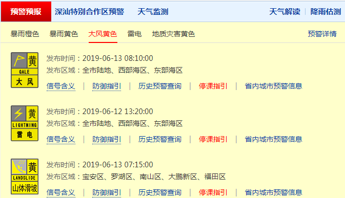 【深圳市地質(zhì)災(zāi)害氣象風(fēng)險預(yù)警2019年第17號】根據(jù)目前降雨情況,結(jié)合我市地質(zhì)環(huán)境條件,現(xiàn)對全市陸地發(fā)布地質(zhì)災(zāi)害氣象風(fēng)險黃色預(yù)警,氣象因素致上述地區(qū)發(fā)生地質(zhì)災(zāi)害的風(fēng)險較高,請相關(guān)部門和單位做好地質(zhì)災(zāi)害各項(xiàng)防御工作。