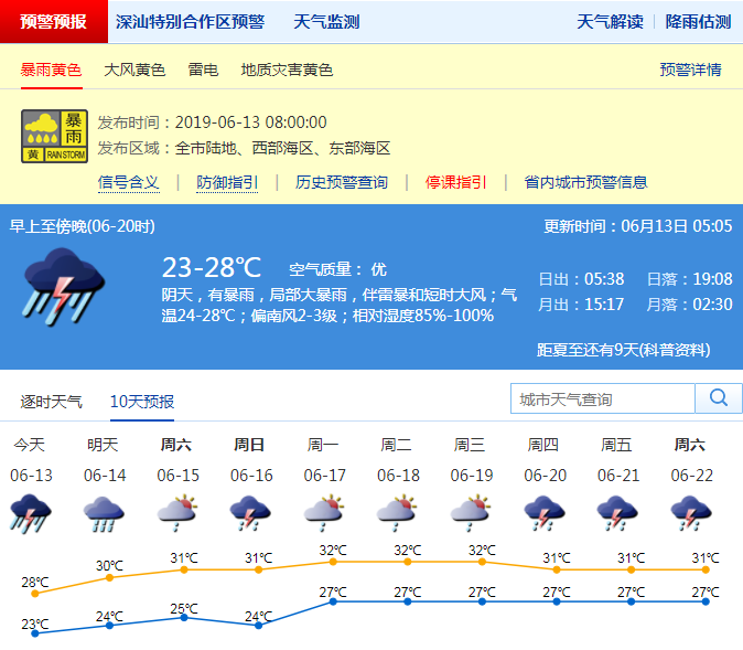 深圳新聞網(wǎng)2019年6月13日訊(記者 施冰冰)深圳市氣象局預(yù)計(jì)13日凌晨至夜間我市有暴雨、局部大暴雨,伴有雷暴,局部地區(qū)有8級左右的短時大風(fēng)。14日白天降雨逐漸減弱。15-16日多云,有陣雨或雷陣雨,17-19日多云炎熱。