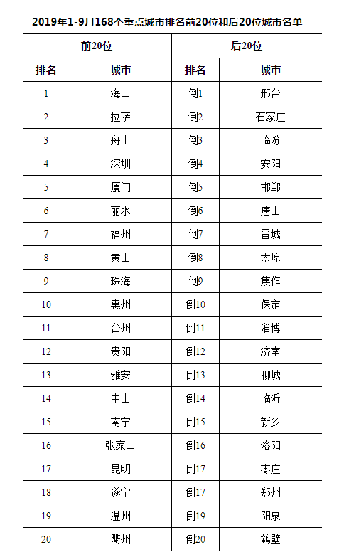 晶報2019年10月24日訊 10月23日,生態(tài)環(huán)境部發(fā)布2019年1—9月全國空氣質(zhì)量狀況。數(shù)據(jù)顯示,168個重點(diǎn)城市空氣質(zhì)量排名中,深圳位于???、拉薩、舟山之后,排名全國第四。