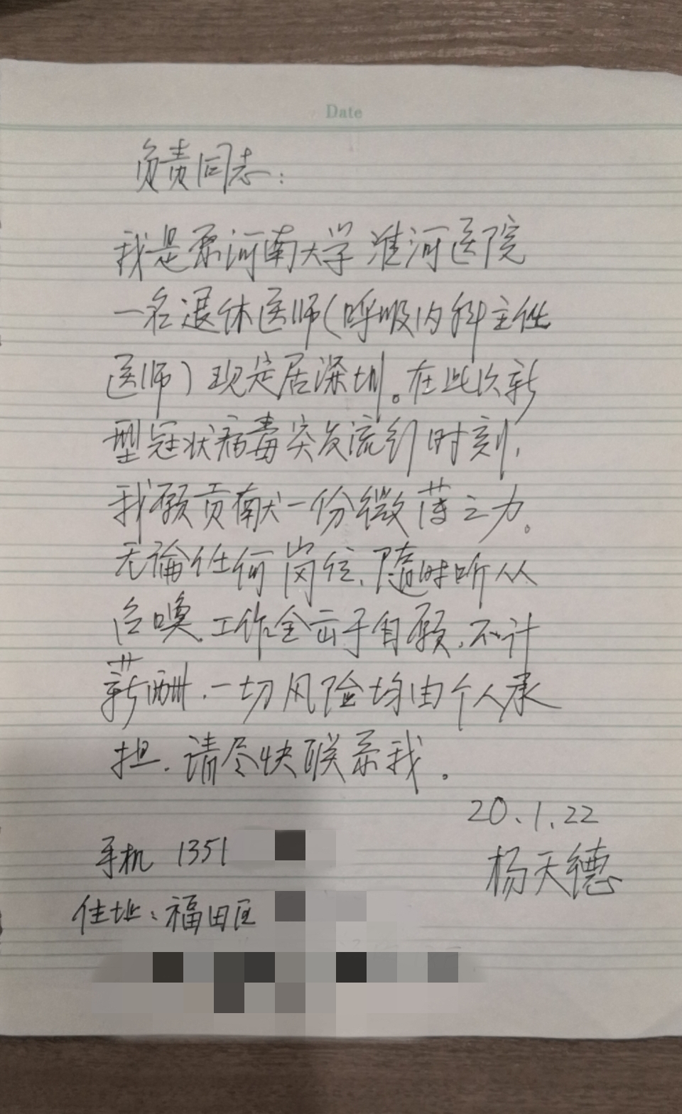 深圳新聞網(wǎng)2月4日訊(見(jiàn)圳客戶端、深圳新聞網(wǎng)記者 邱曉潔)1月23日,福田街道海濱社區(qū)工作站收到一封請(qǐng)?jiān)笗?shū),上面寫(xiě)著:“我愿貢獻(xiàn)一份微薄之力,無(wú)論任何崗位,隨時(shí)聽(tīng)從召喚,工作全出于自愿,不計(jì)薪酬,一切風(fēng)險(xiǎn)均由個(gè)人承擔(dān)?!痹谡?qǐng)?jiān)笗?shū)的最后,還附上了自己和愛(ài)人的聯(lián)系電話及住址。