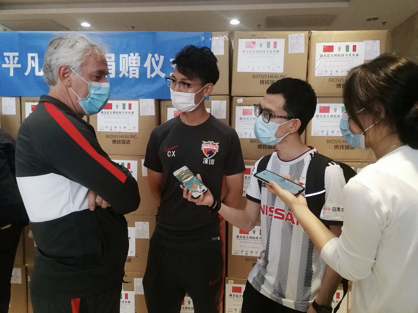 “感謝深圳?!碑?dāng)天,AC米蘭俱樂部前教練、深圳佳兆業(yè)足球隊主教練多納多尼作為在深意大利人代表也來到了活動現(xiàn)場。他表示,來深圳不到一年,已經(jīng)深刻感受到深圳的城市魅力?!爸袊谶@次抗擊疫情的過程中表現(xiàn)完美,每個人的一舉一動不僅是為自己,更是為別人,這非常令我感動。此次捐贈對于意大利來說十分重要,我代表我的祖國向大家表示由衷的感謝。”多納多尼在現(xiàn)場動情地說。(記者 許舜鈿)