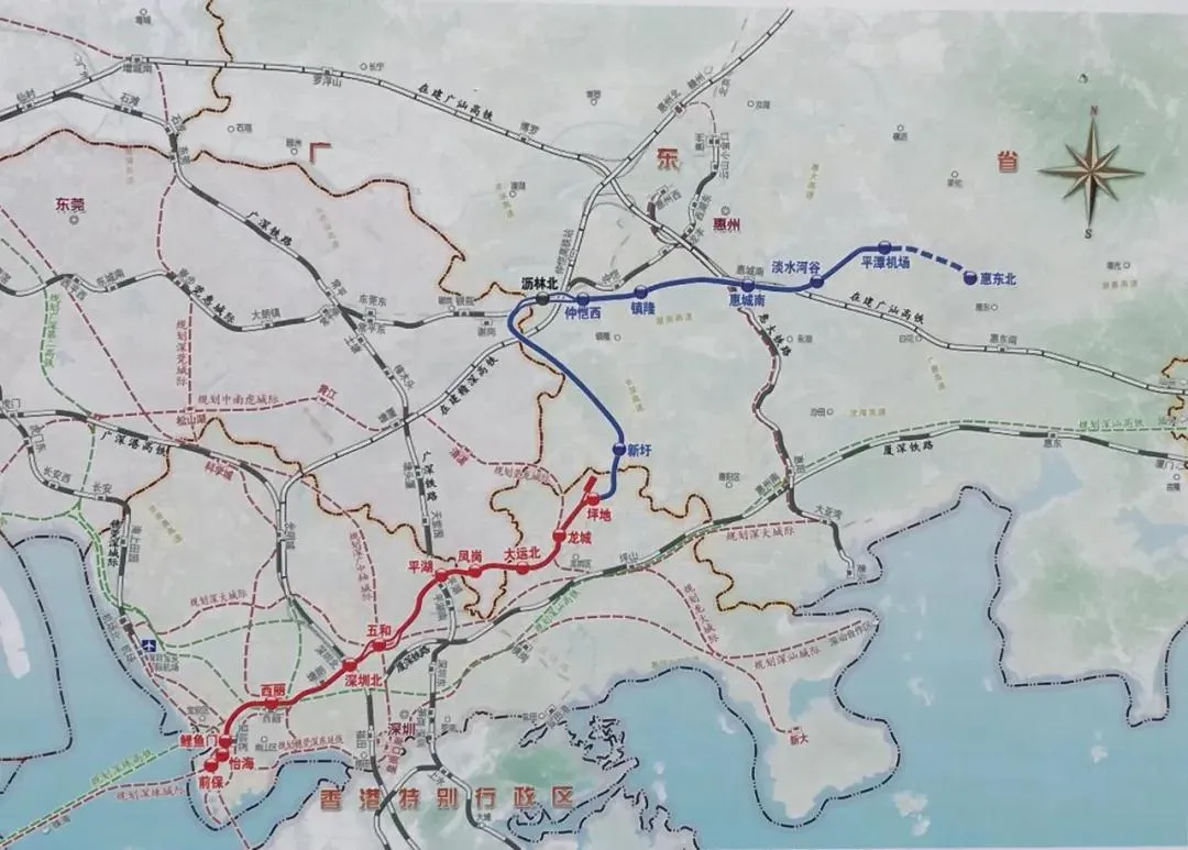 深汕高鐵:起自西麗站,經(jīng)南山區(qū)、羅湖區(qū)、龍崗區(qū)、坪山區(qū)、惠州市至深汕特別合作區(qū)深汕站,銜接廣汕鐵路,全長127公里。