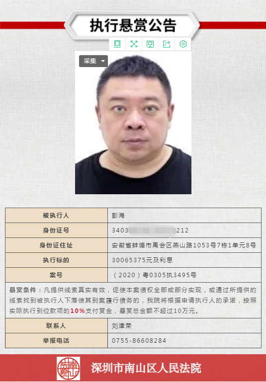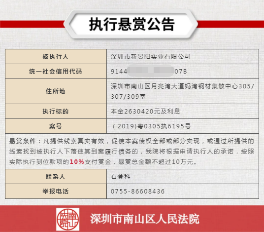 經(jīng)申請(qǐng)執(zhí)行人申請(qǐng),深圳市南山區(qū)人民法院向社會(huì)發(fā)布懸賞舉報(bào)公告,凡提供線索真實(shí)有效,促使本案?jìng)鶛?quán)全部或部分實(shí)現(xiàn),或通過所提供的線索找到被執(zhí)行人下落使其到案履行債務(wù)的,深圳市南山區(qū)人民法院將根據(jù)申請(qǐng)執(zhí)行人的承諾,按照實(shí)際執(zhí)行到位款項(xiàng)給予一定金額的賞金。
