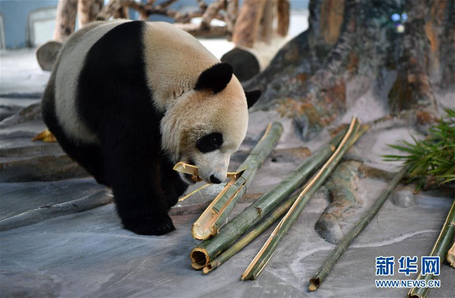11月25日,大熊貓“舜舜”在海南熱帶野生動(dòng)植物園熊貓館吃竹子。新華社記者 郭程 攝