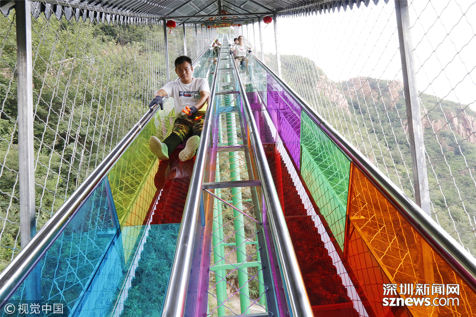 2018年8月11日,鄭州,雙排高空玻璃滑道亮相伏羲山三泉湖景區(qū),整條滑道從高空俯視,呈龍形蜷曲姿態(tài)俯臥于玫瑰嶺下。