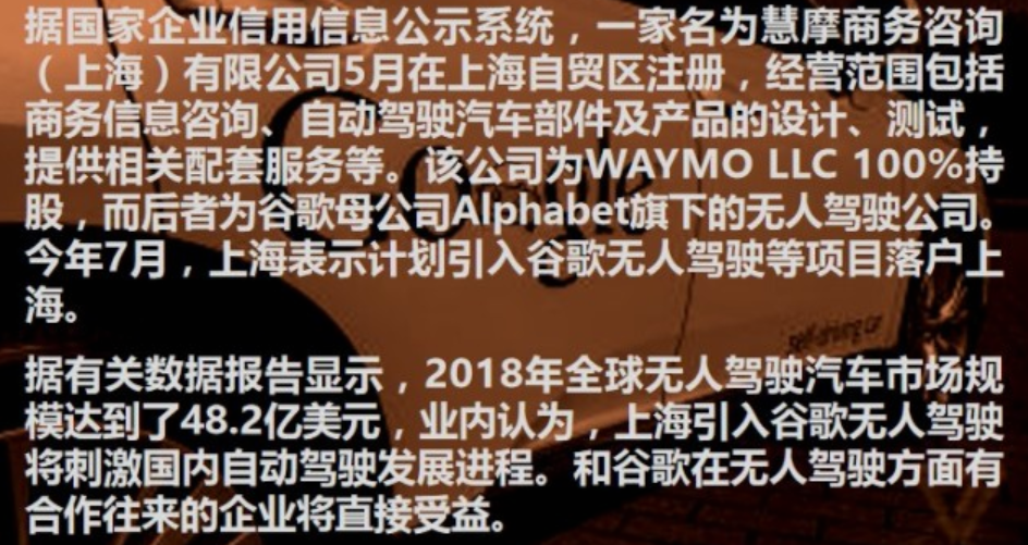 谷歌母公司Alphabet旗下研究自動(dòng)駕駛的部門Waymo在自動(dòng)駕駛領(lǐng)域處于全球領(lǐng)先水平,當(dāng)前其已經(jīng)完成800萬(wàn)英里(約1287萬(wàn)公里)自動(dòng)駕駛汽車公共道路測(cè)試,模擬測(cè)試?yán)锍踢_(dá)到50億英里(約80.47億公里)。Waymo計(jì)劃在為今年下半年向部分地區(qū)的美國(guó)消費(fèi)者推出無(wú)人駕駛服務(wù)。