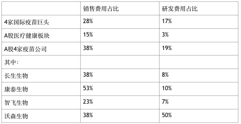 從科研投入來(lái)看,其與國(guó)際巨頭亦存在巨大差距。以A股為例,目前上市有4家以疫苗為主業(yè)的企業(yè)。Wind數(shù)據(jù)顯示,2017年4家疫苗公司總銷售費(fèi)用達(dá)18億元,占營(yíng)業(yè)收入38%;4家國(guó)際疫苗巨頭(輝瑞、默沙東、賽諾菲、GSK)總銷售費(fèi)用占比28%。反觀研發(fā)費(fèi)用,A股醫(yī)療保健板塊總研發(fā)費(fèi)用319億元,占總營(yíng)業(yè)收入的2.8%;4家疫苗公司除沃森生物外,研發(fā)費(fèi)用占比均未超過(guò)10%;4家國(guó)際疫苗巨頭總研發(fā)費(fèi)用占比17%。