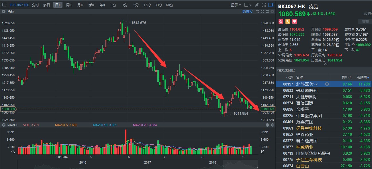 據(jù)智通財經(jīng)APP觀察,截至9月10日,上證跌了1.21個點;恒指跌幅超過1.33%,50只成分股,僅包括九龍倉置業(yè)(01997)在內的6只股票小范圍飄紅,而醫(yī)藥板塊方面,繼續(xù)下挫,普遍以“掛綠”收盤,大勢可謂慘不忍睹。