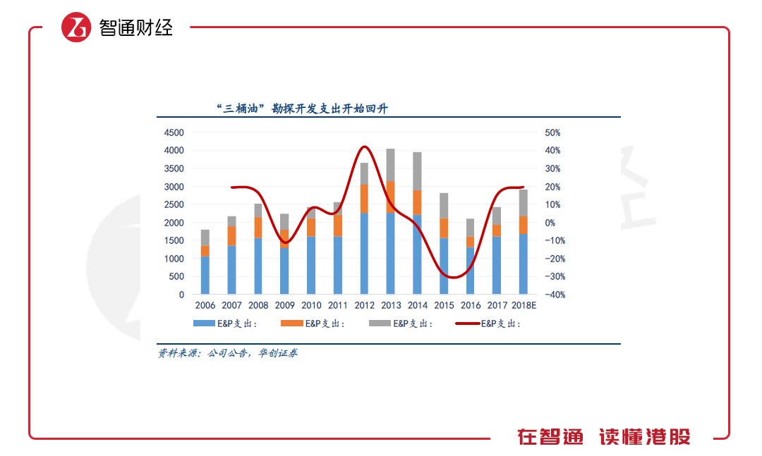 智通財經(jīng)APP了解到,4年的行業(yè)低迷期,中石油、中石化、中海油合計用于勘探、開發(fā)的資本支出從2014年的3954億元人民幣(單位下同),下降至2016年的2112億元,“三桶油”國內(nèi)原油產(chǎn)量也從2014年的13.63億桶下降至2017年的12.50億桶。
