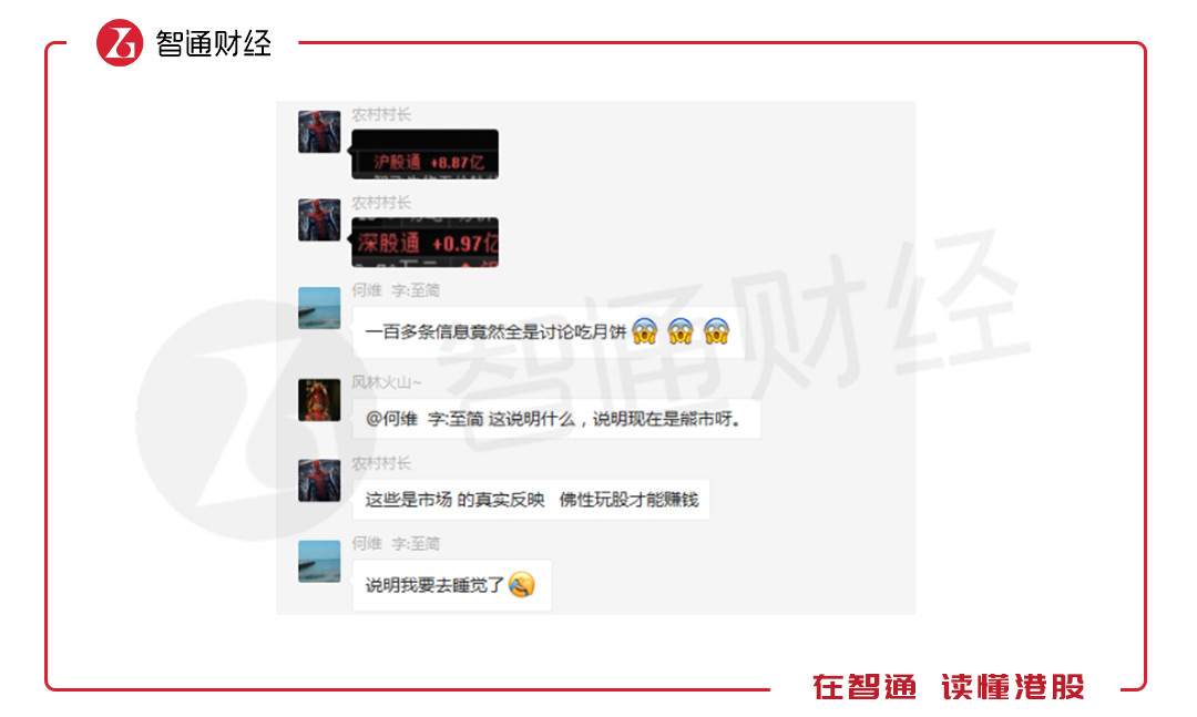 被黑天鵝痛擊一番后,市場(chǎng)悲觀情緒明顯占據(jù)了上風(fēng)。智通財(cái)經(jīng)APP觀察到,某500人的投資大群雖活躍度照常,但全變成了說(shuō)“新財(cái)富風(fēng)月”、“品月餅”,絲毫沒有往日的“談市場(chǎng)、擺數(shù)據(jù)、說(shuō)動(dòng)向”,甚至不惜爭(zhēng)個(gè)臉紅耳赤的情形。