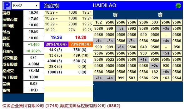 智通財經APP獲悉,海底撈(03690)將于9月26日掛牌,上市前夕,據輝立交易場資料顯示,暗盤收報19.26元,較招股價17.80元漲1.46元,漲8.20%。每手1000股,不計手續(xù)費,每手賺1460元。(文文)