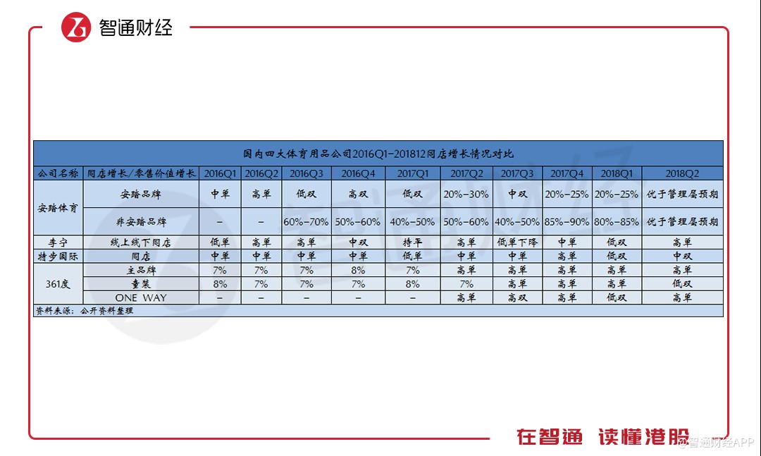 智通財(cái)經(jīng)APP根據(jù)公開資料整理發(fā)現(xiàn),特步過往季度的同店銷售增長(zhǎng)水平時(shí)常保持在中單位數(shù)甚至低單位數(shù)的增長(zhǎng)水平,直到2018年一季度才實(shí)現(xiàn)低雙位數(shù)增長(zhǎng),這也是公司自2013年一季度開始披露這一數(shù)據(jù)以來,首次達(dá)到雙位數(shù)增長(zhǎng)。