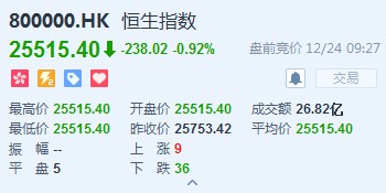 智通財(cái)經(jīng)APP獲悉,恒生指數(shù)開(kāi)盤(pán)跌238.02點(diǎn)或0.92%,報(bào)25515.4點(diǎn)。國(guó)企指數(shù)跌1.1%,報(bào)9990.09點(diǎn)。紅籌指數(shù)跌0.91%,報(bào)4086.09點(diǎn)。大市盤(pán)前成交26.82億港元。因圣誕節(jié)假期,港股通北向關(guān)閉,港股今日僅上午開(kāi)市,下午休市。12月25日(星期二)及26日(星期三)則全天休市,之后恢復(fù)正常。
