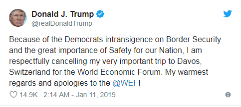特朗普表示,由于民主黨在邊境安全問題上的頑固態(tài)度和國家安全的重要性,他謹(jǐn)慎地取消前往瑞士達(dá)沃斯參加世界經(jīng)濟(jì)論壇的行程,并向世界經(jīng)濟(jì)論壇致以問候和歉意。另外,美國政府高級(jí)官員表示,即使本月晚些時(shí)候政府仍處于關(guān)閉狀態(tài),美國財(cái)政部長姆努欽將帶領(lǐng)美國政府代表團(tuán)出席達(dá)沃斯論壇。