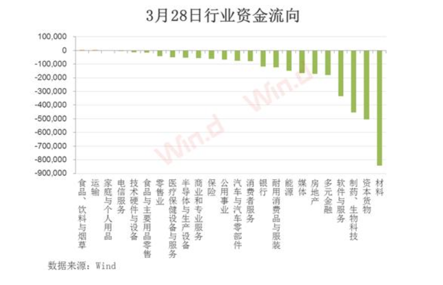 從3月28日行業(yè)主力資金流向來(lái)看,絕大多數(shù)行業(yè)出現(xiàn)凈流出,累計(jì)凈流出逾350多億元。其中,材料板塊流出最多,超過(guò)80億元;資本貨物、制藥與生物科技板塊凈流出均超過(guò)40億元。