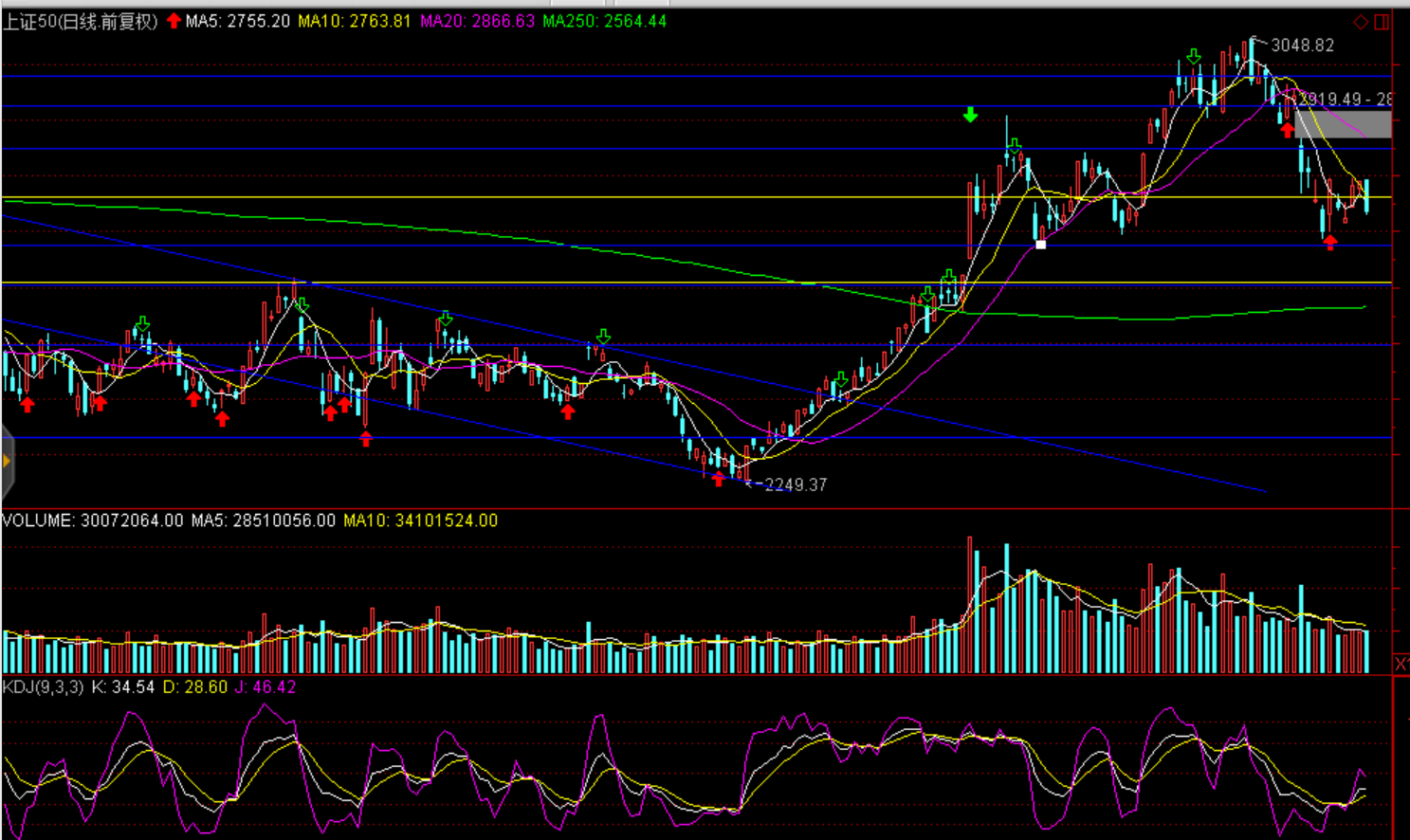 技術(shù)面:本周探底企穩(wěn)、上證50于2670點一線、滬綜指2780--2820點區(qū)間、創(chuàng)業(yè)板1430--1460點區(qū)間;關(guān)注周三(22日)前后變盤周期。