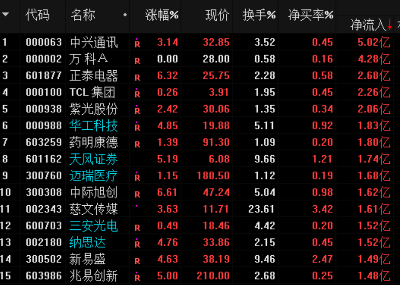 兩市資金流向:凈流入、流出排名: