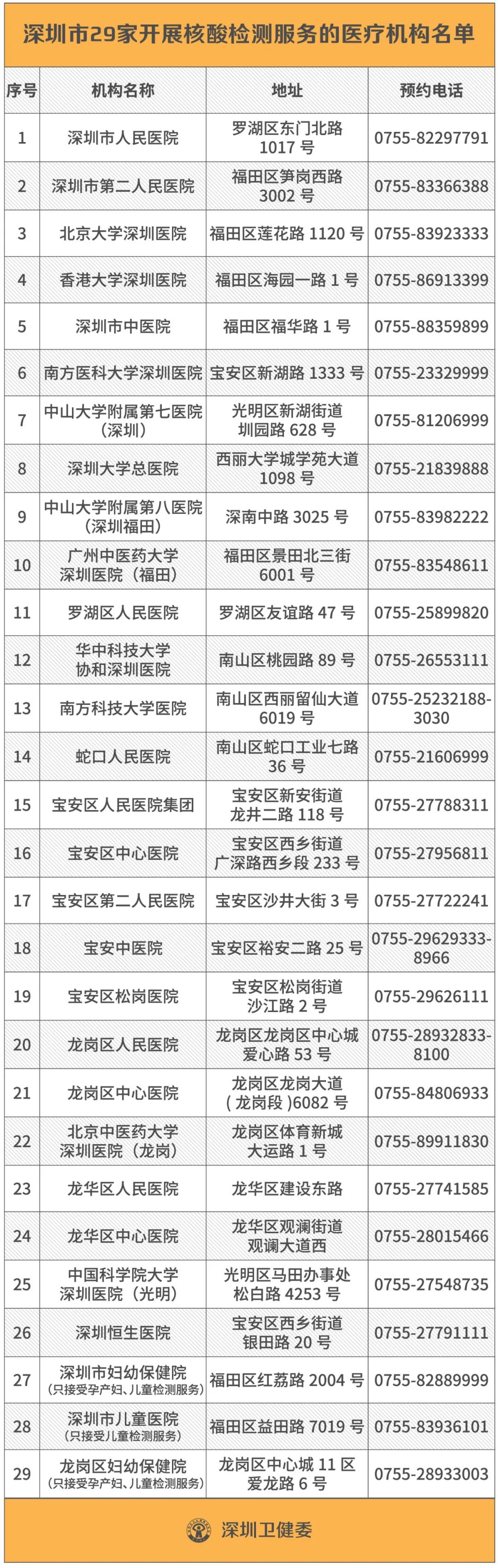 跨境學生可聯(lián)系全市提供核酸檢測的29家醫(yī)療機構(詳見附件,含醫(yī)院名稱、地址和聯(lián)系電話)中的任意一家進行檢測,部分醫(yī)院有預約要求,部分醫(yī)院對檢測服務時間有限定,因此首次前往檢測前,請先拔打聯(lián)系電話了解醫(yī)院是否需要預約和服務時間安排。